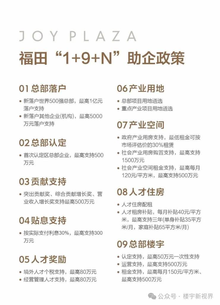 福田助企政策:“1+9+N”政策,福田区产业高质量发展,针对进驻企业规模可一事一议。