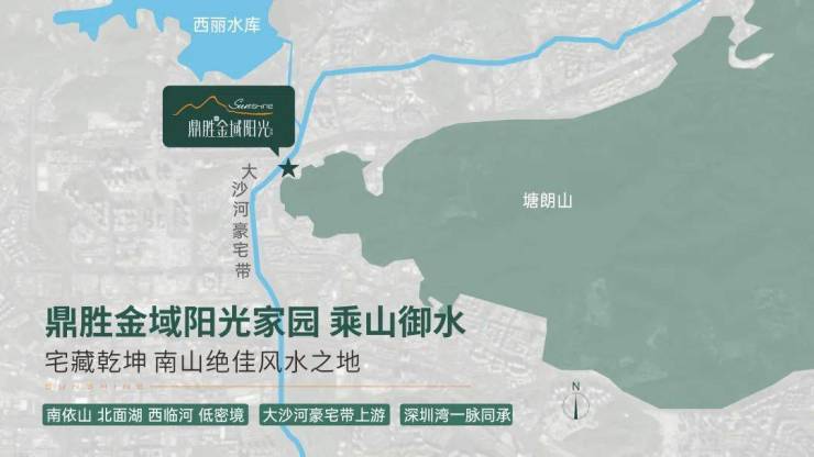 鼎胜金域阳光家园位于南山区西丽珠光北路东侧,背 靠塘朗山,景观资源优秀,有天然氧吧画面感。不只有山景,还有河流。项目大门正对面,就是 大沙河生态走廊,住在里面环境优雅,空气清新
