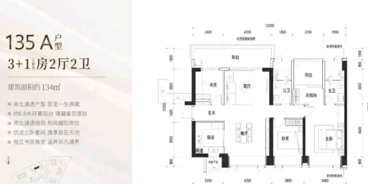 134㎡的4房2厅2卫,A户型(1栋1/2单元05户型),设计的是竖厅南北通透格局,进门入户玄关,客厅4.2米开间,LDKB一体化设计,四开间朝南,4个卧室分别做到了主卧19.44㎡/次卧10.64㎡/次卧10.26㎡/次卧7.8㎡(包含墙体飘窗),客厅连接次卧出6.8米长的观景大阳台看深大校区,U型厨房,卫生间干湿分离,得房率约90%(包含赠送),西北朝向。
