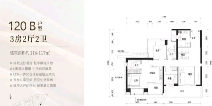 117㎡的3房2厅2卫,B户型(2栋4单元01.02.05/3栋2单元02/05户型),设计的是经典竖厅格局,客厅3.8米开间,LDKB一体化设计,3个卧室分别做到了主卧28.6㎡/次卧9.6㎡/次卧7.05㎡(包含墙体飘窗),客厅连接次卧出6.15米长的宽景大阳台,U型厨房,卫生间干湿分离,得房率约90%(包含赠送),东南或正东朝向。其实也可以改4房。
