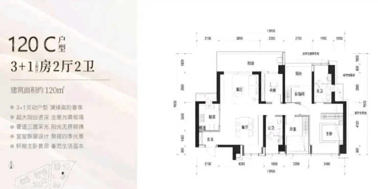 120㎡的4房2厅2卫,C户型(2栋3单元01户型),设计的是竖厅格局,客厅3.85米开间,LDKB一体化设计,动静分区,4个卧室分别做到了主卧16.65㎡/次卧9.9㎡/次卧9.16㎡/次卧6.3㎡(包含墙体飘窗),客厅连接次卧出6.1米长的宽景大阳台,U型厨房,卫生间干湿分离,得房率约90%(包含赠送),西北朝向。