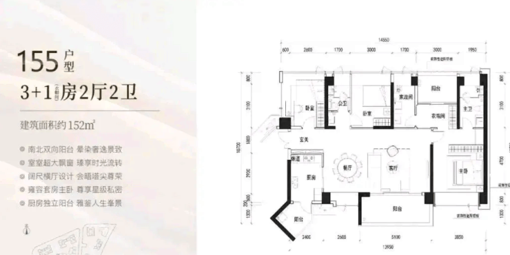 152㎡的4房2厅2卫,3栋2单元01户型,设计的是横厅南北通透格局,进门入户玄关,客餐厅7.7米开间,LDKB一体化设计,四开间朝南,4个卧室分别做到了主卧21.17㎡/次卧12.4㎡/次卧11.7㎡/次卧11.7㎡(包含墙体飘窗),客厅出5.1米长阳台,L型厨房带1个生活阳台,公卫三段式分离,得房率约90%(包含赠送),东南朝向。