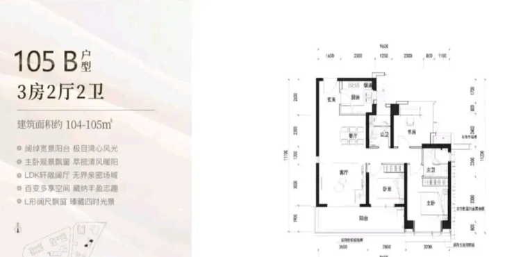 105㎡的3房2厅2卫,B户型(2栋3单元02/06户型),设计的是经典竖厅格局,客厅3.6米开间,LDKB一体化设计,三开间朝南,动静分区,3个卧室分别做到了主卧13.12㎡/次卧9.9㎡/次卧8.4㎡(包含墙体飘窗),客厅连接次卧出6.4米长的宽景大阳台,U型厨房,卫生间干湿分离,得房率约90%(包含赠送),正南或东南朝向。