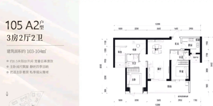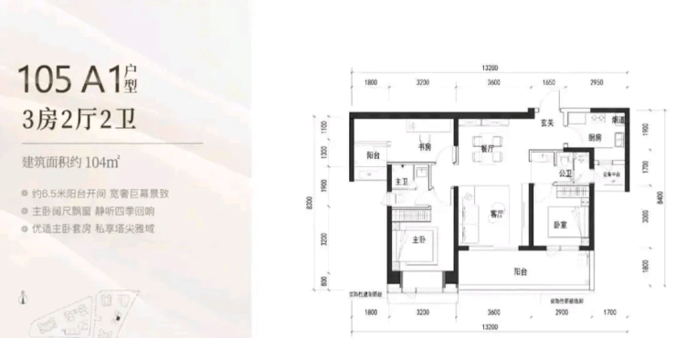 104㎡的3房2厅2卫,A1户型(2栋3单元03户型),设计的是竖厅类双龙抱珠格局,客厅3.6米开间,客餐厅一体化设计,3个卧室分别做到了主卧12.8㎡/次卧12㎡/次卧8.7㎡(包含墙体飘窗),客厅连接次卧出6.5米长的宽景大阳台,U型厨房,公卫三段式分离,得房率约90%(包含赠送),东南朝向。