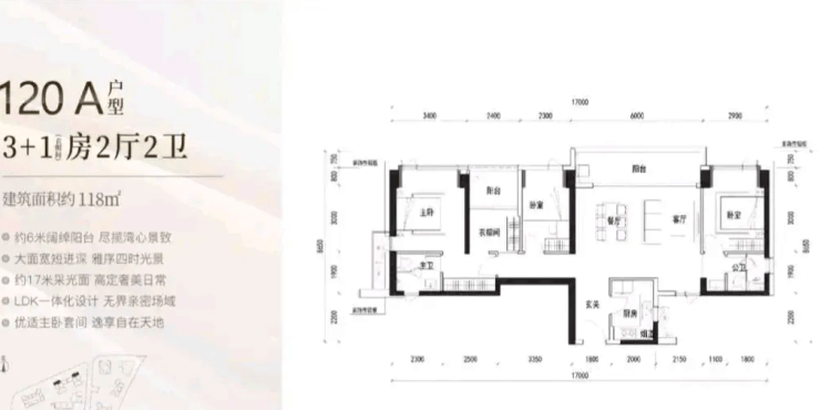 118㎡的4房2厅2卫,A户型(1栋1/2单元01户型),设计的是横厅格局,进门入户玄关,客餐厅6米开间,LDKB一体化设计,4个卧室分别做到了主卧17.65㎡/次卧11.02㎡/次卧9.12㎡/次卧8.74㎡(包含墙体飘窗),客餐厅出6米长的观景大阳台看深大校区,U型厨房,公卫三段式分离,得房率约90%(包含赠送),西北朝向。