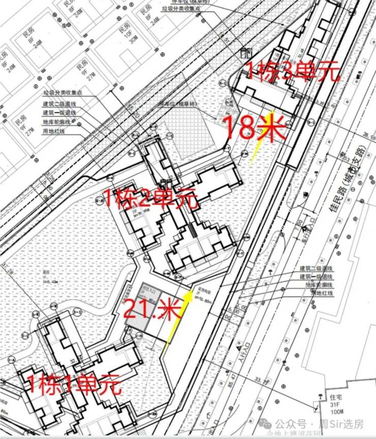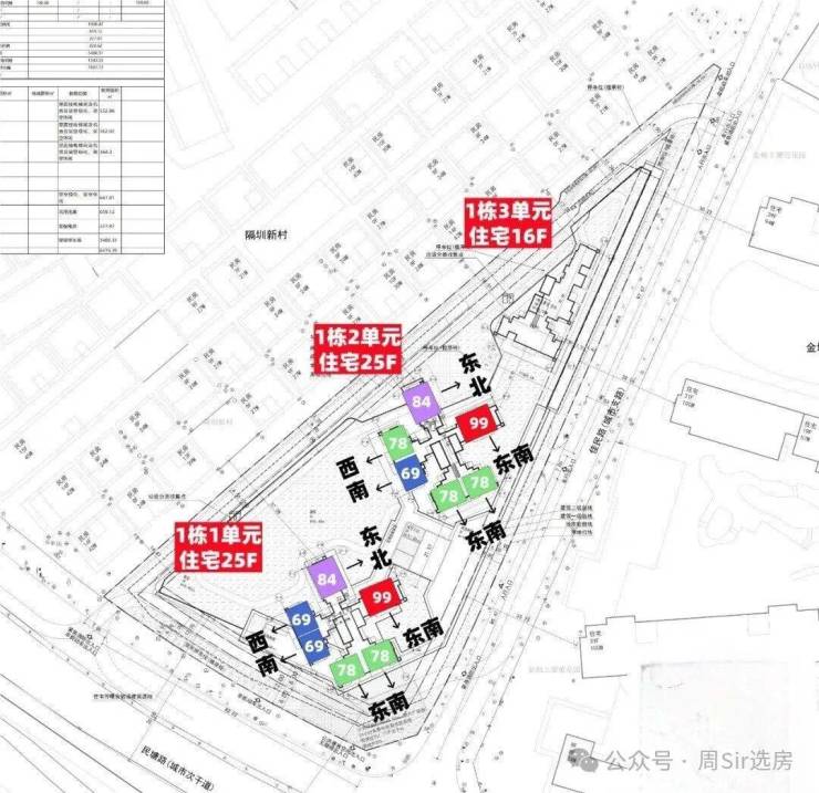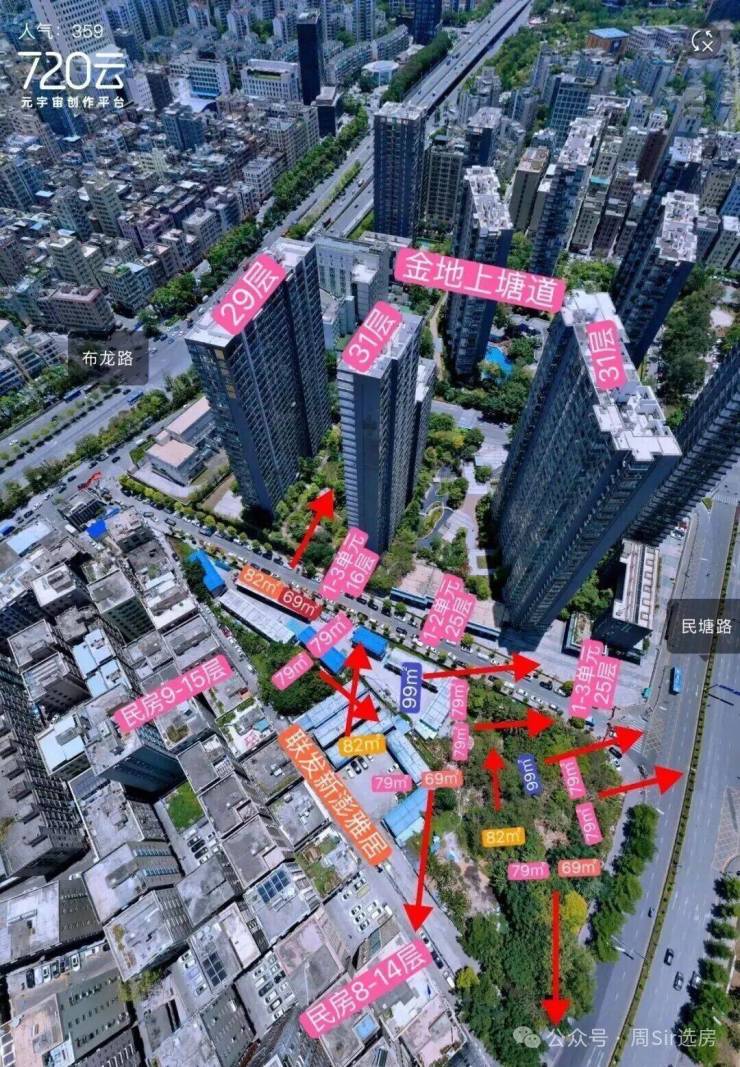 从楼栋的分布看,1栋2单元84平主卧到隔圳新村的间距是16.2米,1栋3单元有37米,3单元到金地上塘道二期是28.9米,1单元的78平离金地上塘道二期也有33米,这个距离还包含了佳民路本身的路宽,所以都算是“握手楼”的范畴,站在马路上就能看见里面的阳台和窗户。