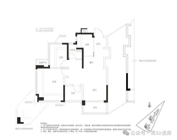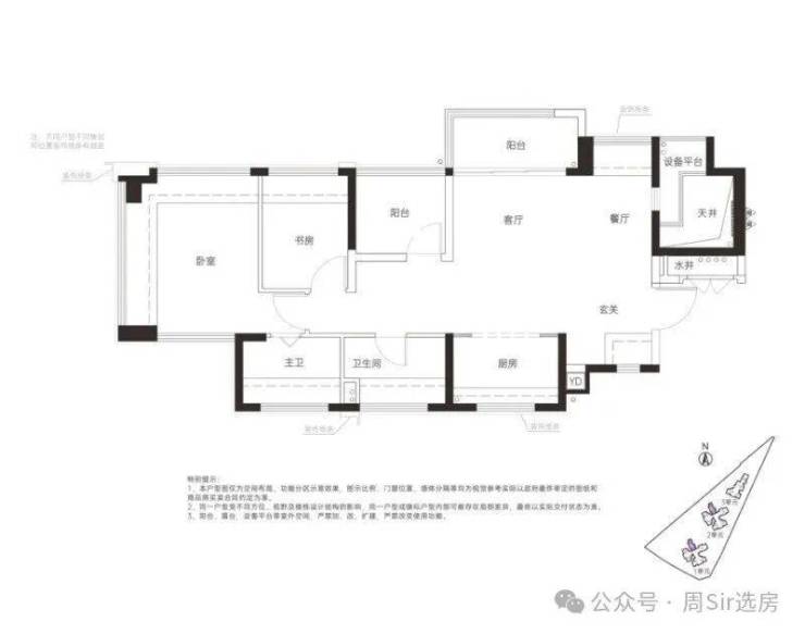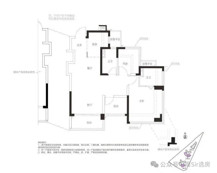 78㎡的3房2厅2卫,设计的是竖厅格局,客厅3.4米开间,LDKG+X空间一体化,S墙设计预留冰箱卡槽位,动静分区,三开间朝南,主卧+1个次卧都是双飘窗设计,次卧带1个设备平台放空调机位,U型厨房,卫生间干湿分离,公卫带1个设备平台可日常使用,得房率:100%(包含赠送),西南或东南朝向。