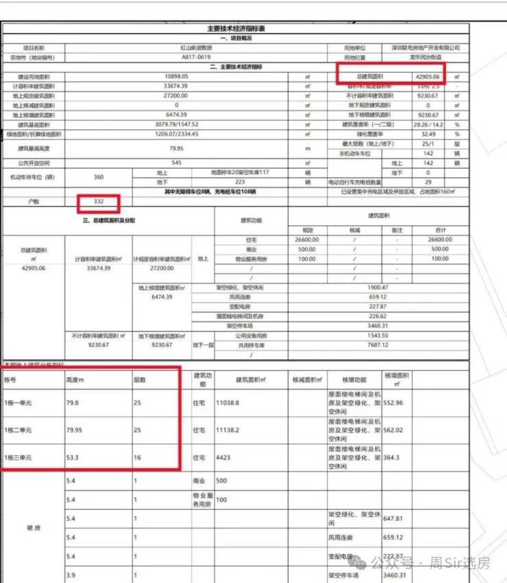 项目1栋1/2单元2梯6户,1栋3单元2梯4户设计,地下室有1层,规划360个车位,车位比1:1.08。