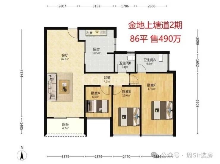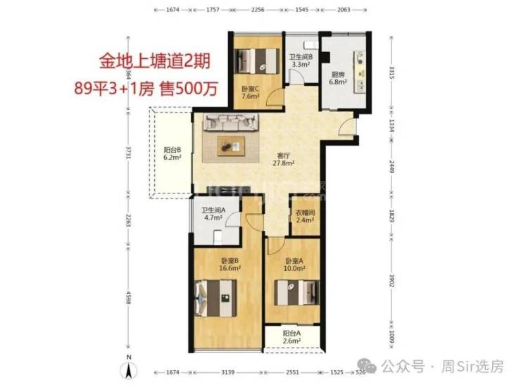 旁边的金地上塘道二期,一个89平的三房两卫户型是490万,89平的三加一房型则在500至510万之间,均价为5.7万。