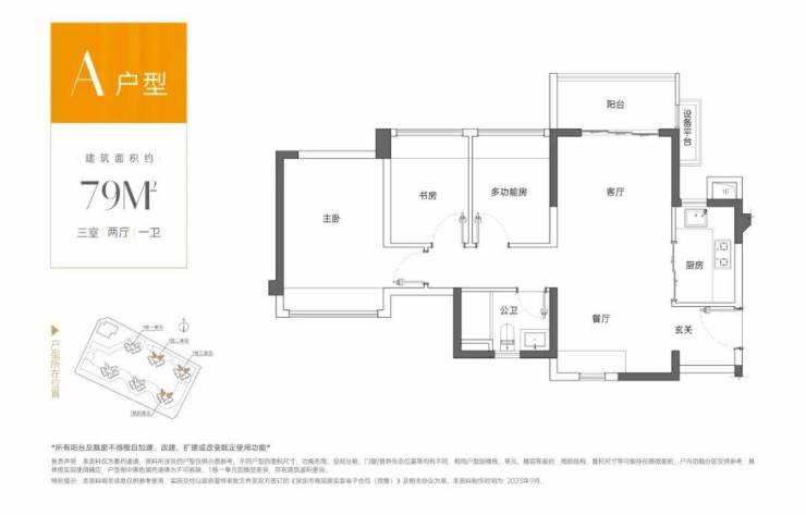 79㎡的3房2厅1卫,设计的是竖厅南北通透格局,进门独立入户玄关,客厅3.3米开间,动静分区,主卧南北通双飘窗设计,3个卧室分别做到了主卧11.99㎡/次卧6.14㎡/次卧6.12㎡(实测面积,去掉墙体),得房率:79.78%(不含赠送),L型厨房,阳台进深1.5米,主朝东北或西北向。