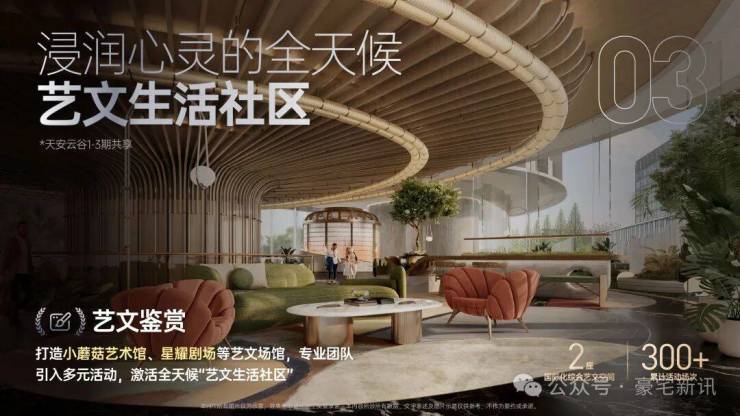 文体艺术:项目打造约3000㎡小蘑菇艺术馆、750㎡星耀剧场,已开展:印象派150周年光影展中国首站(该展已结束)、深圳首个社区戏剧节等重磅活动;每年超200场话剧、音乐会、艺术展落地;此外,距离项目2公里内就有龙岗国际艺术中心(2个地铁站即可到达)和坂田文体中心(预计2026年2季度建成)。