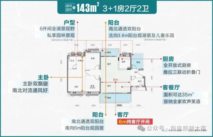 143㎡ 3+1房2厅2卫采用南北通透双阳台的设计,客厅达6米开间,搭配全景落地窗,双景观南向阳台看园林景观,北向阳台看湖景,该户型处于楼王位置,楼间距开阔,南北阳台将3.4万m²原生湖景尽收眼底。该楼栋采用2梯3户设计居住私密性强。精装交付全屋以意式轻奢极简约风交付。厨房配备嵌入式窗柜与三件套,入户有定制鞋柜,硬装品质高。主卧为30m²大套间,独立衣帽间和干湿分离卫浴。