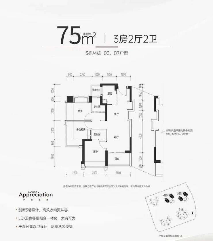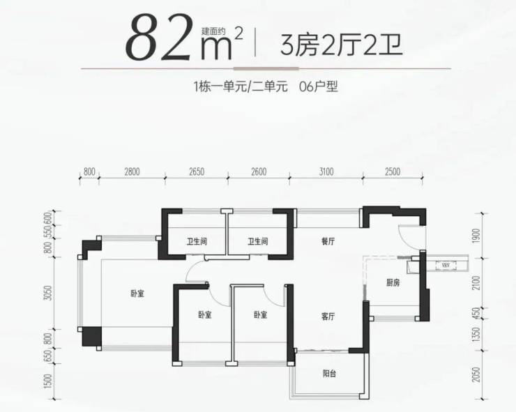 82㎡的3房2厅2卫,03户型,设计的是竖厅格局,进门独立玄关,LDKB一体化,S墙设计预留冰箱卡槽位,主卧双飘窗设计,L型厨房,卫生间干湿分离,得房率约100%(包含赠送),西南朝向。