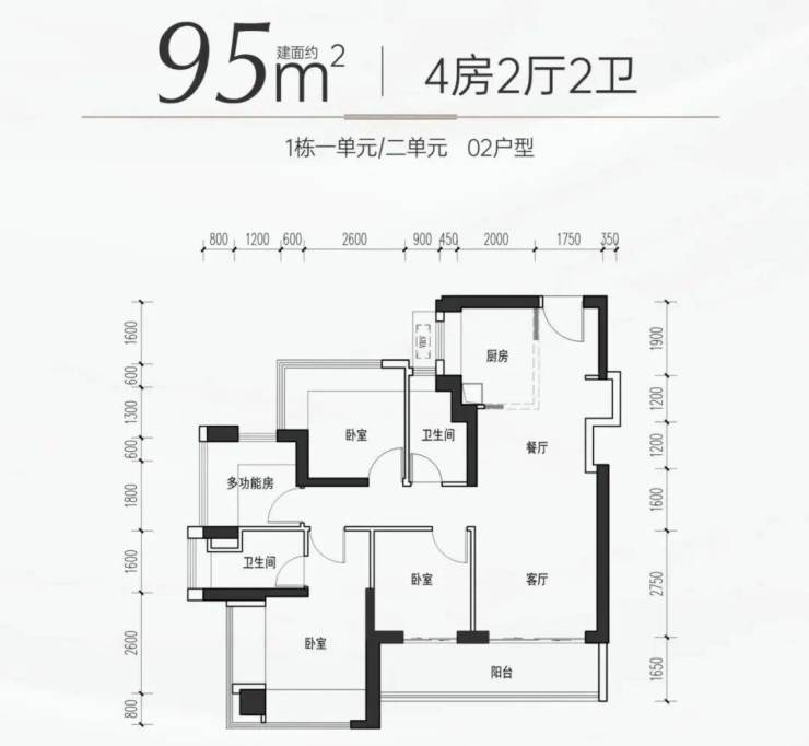 95㎡的4房2厅2卫,设计的是竖厅格局,进门独立玄关,LDKB一体化,S墙设计预留冰箱卡槽位,主卧双飘窗设计,客厅连接次卧出6米长的大阳台,L型厨房,卫生间干湿分离,得房率约97%(包含赠送),西南朝向。
