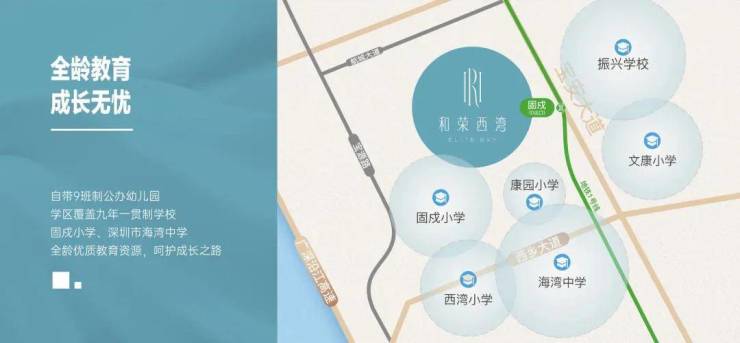 项目自带9班制公办幼儿园,学区覆盖九年一贯制固戍小学、深圳市海湾中学,启航精英人生路。