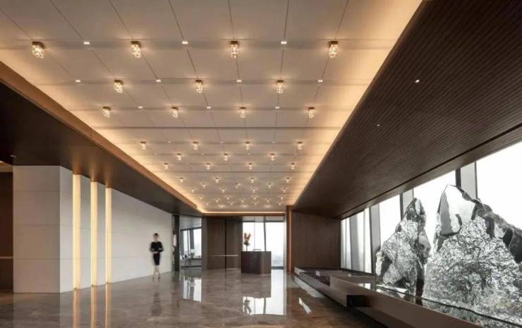 材质选择上也是非常极致,地面选用世界名贵石材意大利超白洞,搭配天花的反光面烤漆材质,质感十足。