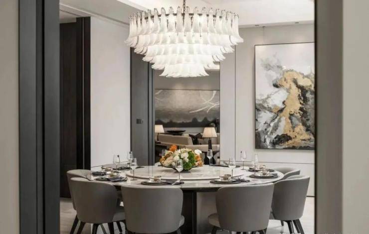 1150㎡平层中,与会客厅相连的是宴会区域,面积达38 ㎡,两侧均设有推拉门可保证用餐的私密。考虑到宴请的多样性,中西双厅的设计也是契合了不同的生活场景。