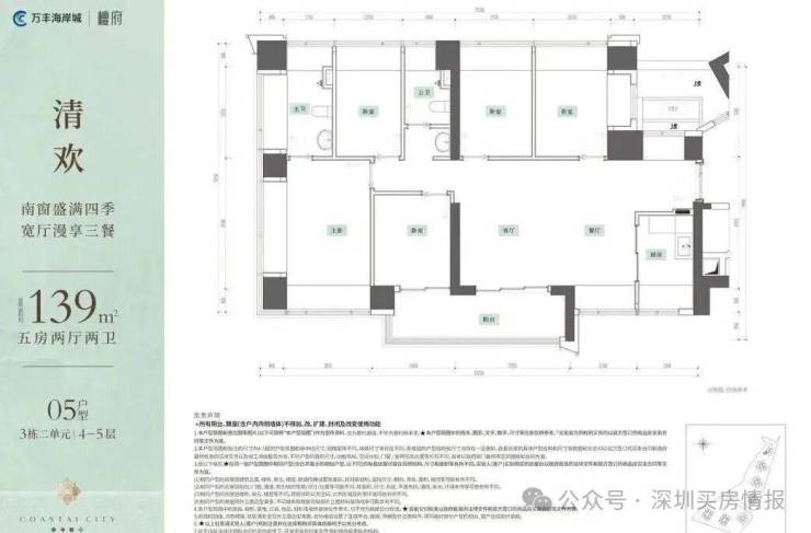 约139㎡5房2厅2卫南向横厅大五房,南北通透,片区独有!户型亮点:• 15米大面宽,约6.8米景观阳台,无遮挡公园视野• 奢配主卧进深4.5米,主卫双飘窗采光可作双台盆• 全屋12个飘窗,懂收纳更懂空间使用
