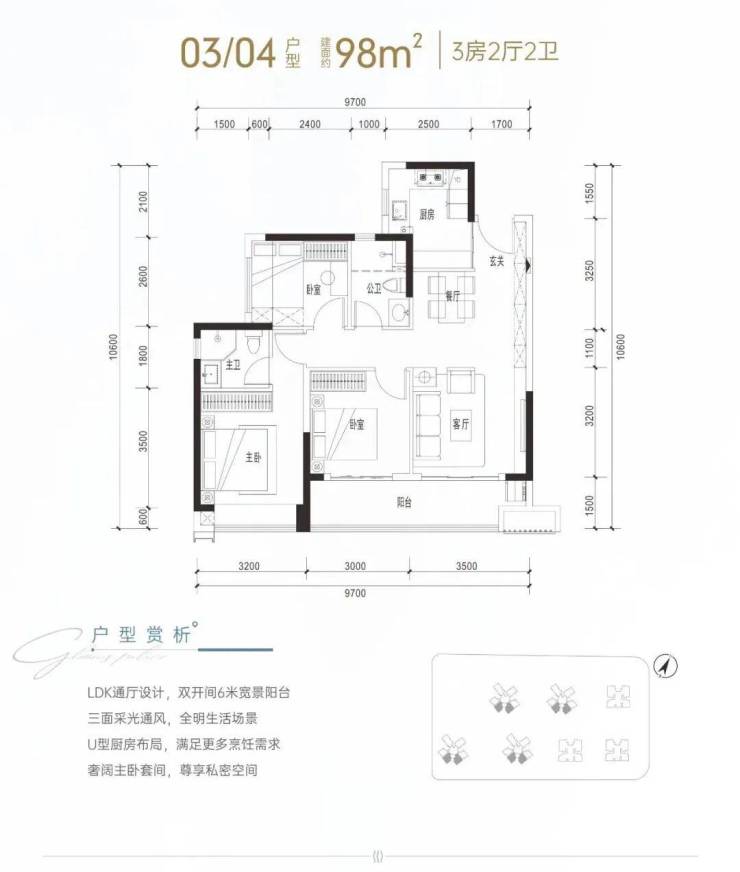 建面约98㎡是传统竖厅动静分区格局,客厅进深7.55米(不含阳台),开间3.5米,配有6.5米宽景阳台,主卧13.18㎡(不含主卫和飘窗),客厅空间变化不大,但厨房和卧室空间要好很多,居住的舒适性会比较好。