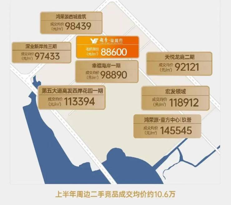根据2023年上半年的成交数据来看,瑞樾府周边的楼龄超10年以上的老小区普遍单价在10万元上下。其中,距离较近的幸福海岸上半年有107㎡的房源成交单价为9.89万/㎡;深业新岸线有139㎡的房源成交单价为9.2万/㎡,今年7月该小区有141㎡的房源以8.8万/㎡单价成交。