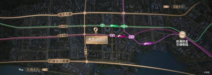 两条地铁线路的附加价值都比较高。乘坐11号线从宝安站到南山的后海站只需要3站,乘坐地铁的纯粹时间只有10分钟;到福田的岗厦北也只需要7站,大约半小时即可抵达;而开车的话,项目约200米直达宝安主干道新湖路,约2公里可到达广深沿江高速的入口。