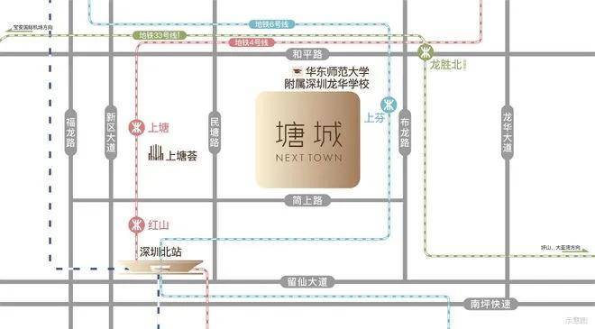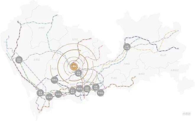 项目近达4号线上塘站、6号线上芬站、33号线龙胜站(在建中)三大地铁轨道,2站深圳北站,3站宝安国际机场。