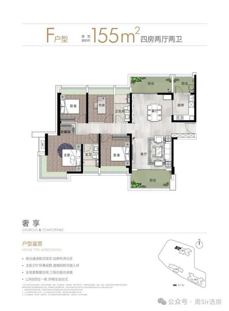 155㎡的4房2厅2卫:(F户型),设计的是竖厅南北通透格局,双阳台,进门入户玄关,LDKB一体化设计,动静分区,四开间朝南,L型厨房还带1个小生活阳台,卫生间干湿分离,得房率约78.72%(不含赠送),客厅阳台主朝西南向。