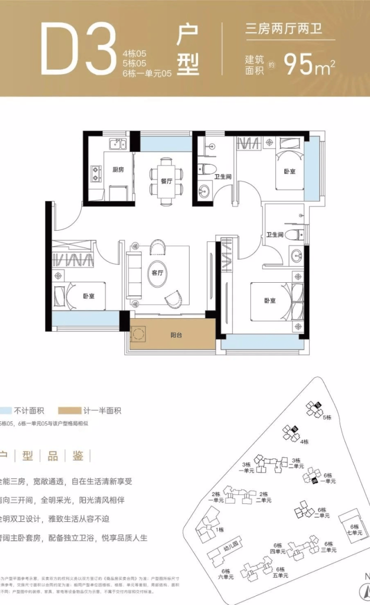 95㎡的3房2厅2卫(D3),设计的是竖厅双龙抱珠格局,客厅3.7米开间,三开间朝南,L型厨房,得房率:72.95%(不含赠送),阳台主朝东南或西南朝向。