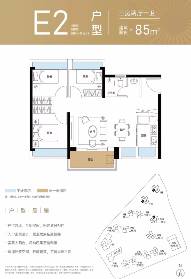 85㎡的3房2厅1卫(E2),设计的是横厅南北通透格局,客厅3.5米开间,L型厨房,卫生间三段式分离设计,得房率:72.95%(不含赠送),阳台主朝东南或西南向看小区园林。