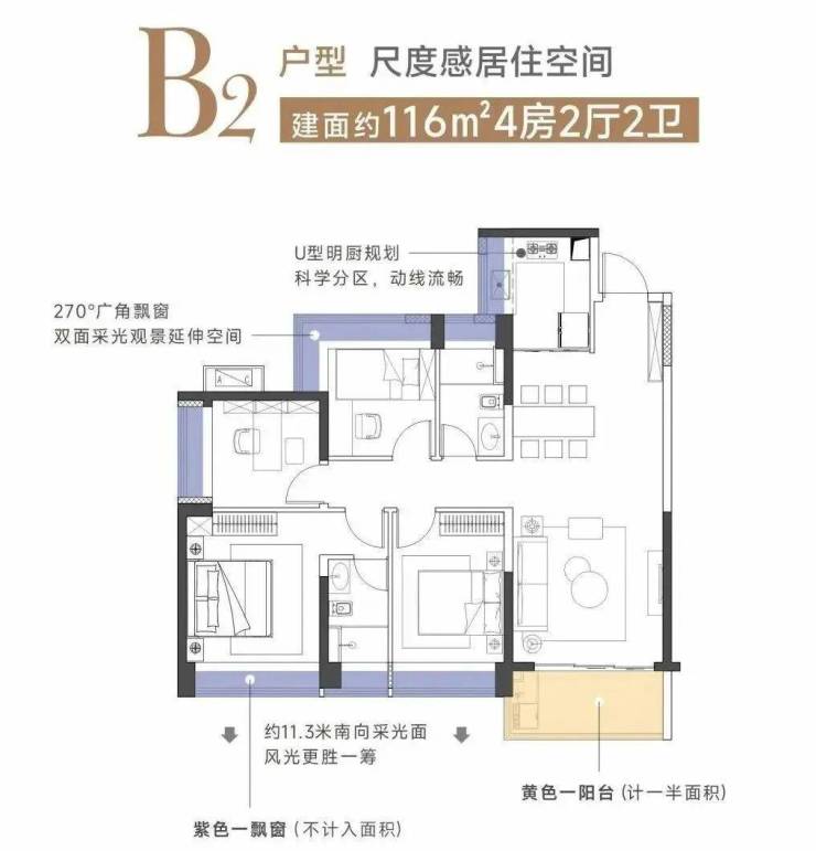 建面约116㎡竖厅4房2厅2卫,非常理想的4个房间的布局,4开间朝南向。几乎每个房间都是满开间的飘窗增加使用率,次卧还可以做270度的一个转角飘窗,实现双面采光,主要就是配置了一个多功能的套房设计,居住更舒适。