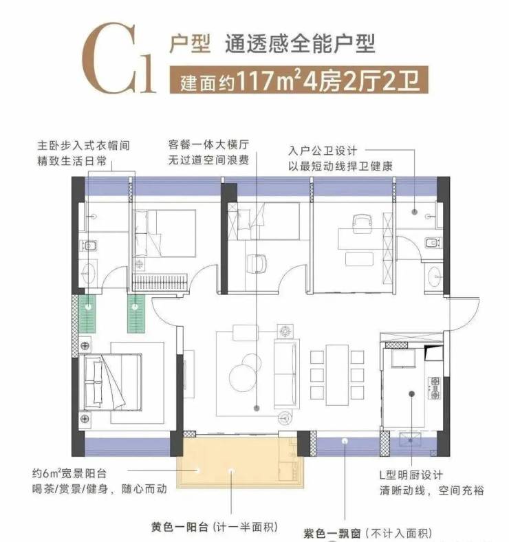 建面约117㎡横厅4房2厅2卫,与116㎡同个面积在横厅设计,自然是可以满足南北通透的需求。