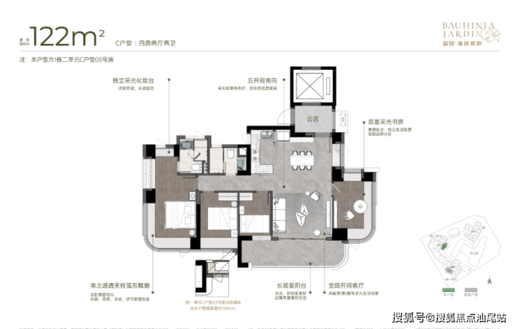 122㎡的4房2厅2卫,设计的是竖厅类双龙抱珠格局,专梯入户送5.7㎡的独立公区,客厅4.1米开间,LDKB一体化设计,五开间朝南,主卧大套间无柱弧形270°转角飘窗,4个卧室分别做到了主卧20.67㎡/次卧11.1㎡/次卧10.6㎡/次卧7.04㎡(包含墙体飘窗),客厅连接次卧出7米长的观景大阳台,U型厨房,卫生间干湿分离,得房率约76.7%(不含赠送),东南朝向。赠送面积20.93㎡(不含公区)),加上赠送后得房率94.09%。