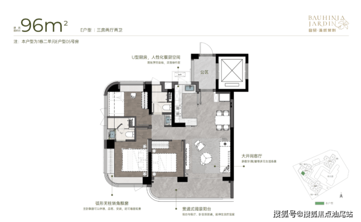 111㎡的3房2厅2卫,2栋05户型,设计的是竖厅格局,专梯入户有送约5.7㎡的独立公区,客厅5.15米开间,超宽客厅,LDKB一体化设计,动静分区,三开间朝南,主卧大套间无柱弧形270°转角飘窗,3个卧室分别做到了主卧17.64㎡/次卧9.12㎡/次卧8.57㎡(包含墙体飘窗),客厅连接次卧出8米长的观景大阳台,U型厨房,卫生间干湿分离,得房率约76.7%(不含赠送),西南朝向。赠送面积18.56㎡(不含公区),加上赠送后得房率约93.65%。