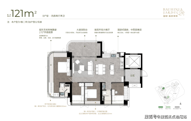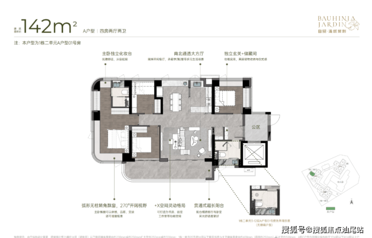 142㎡的4房2厅2卫,2栋01户型,设计的是横厅南北通透格局,专梯入户有送6.86㎡的独立公区,客厅5.15米开间,LDKB一体化设计,五开间朝南,主卧大套间无柱弧形270°转角飘窗,4个卧室分别做到了主卧24.62㎡/次卧11.52㎡/次卧9.4㎡/次卧8.5㎡(包含墙体飘窗),客厅连接次卧出8.5米长的超大观景阳台,U型厨房,卫生间干湿分离,得房率约76.7%(不含赠送),阳台主朝东北向。赠送面积23.86㎡,加上赠送后得房率93.6%。