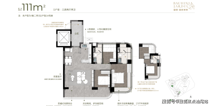 111㎡的3房2厅2卫,2栋04户型,设计的是竖厅格局,专梯入户有送约8.9㎡的独立公区,客厅5.15米开间,超宽客厅,LDKB一体化设计,动静分区,三开间朝南,主卧大套间无柱弧形270°转角飘窗,3个卧室分别做到了主卧17.64㎡/次卧9.12㎡/次卧8.57㎡(包含墙体飘窗),客厅连接次卧出8米长的观景大阳台,U型厨房,卫生间干湿分离,得房率约76.7%(不含赠送),西南朝向。赠送面积18.56㎡(不含公区),加上赠送后得房率约93.65%。