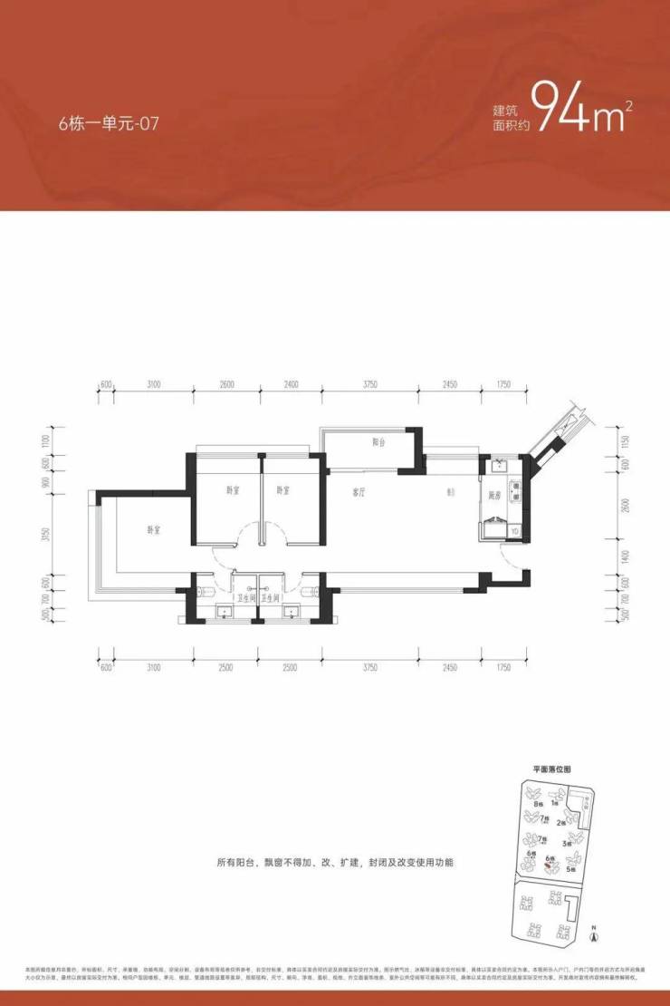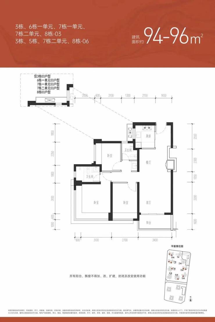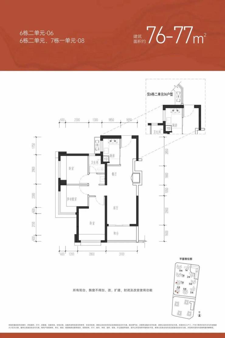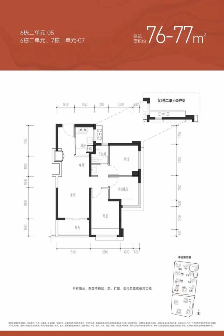 【约76㎡三房一卫】户型分布:只分布在6栋2单元和7栋1单元,共258套