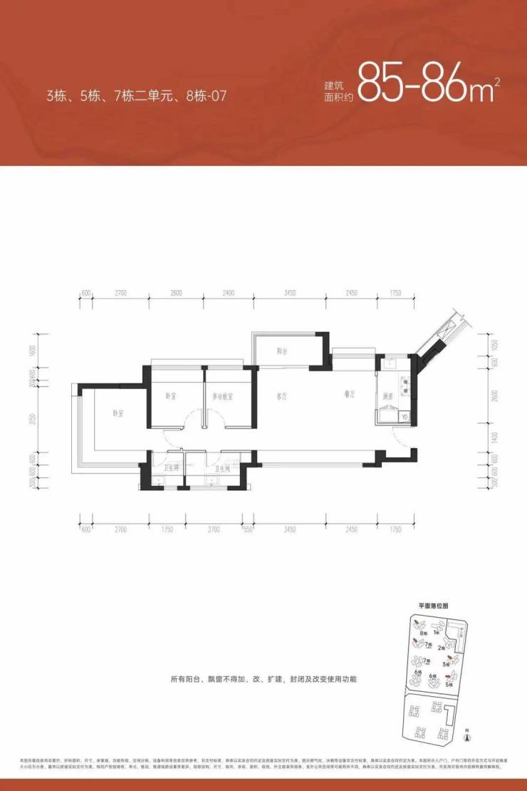 ①户型分析:小面积、低总价,最佳上车首选户型;全南向排布户型,多飘窗的设计,采光通风不错;户型方正,动静分区的设计注重隐私性;明厨明卫,三分离洗手间设计;②朝向:西南、东南向③视野:小区外围,临万丰路,看城市风景,施工建设区域【约85㎡三房两卫】户型分布:分布在7栋2单元、8栋、3栋,共710套,①户型分析:有横厅和竖厅两种户型,全屋7个飘窗、13米采光面,非常通透;预留超多收纳空间主卧双面采光,景观视野更开阔②朝向:东北、西北朝向③视野:社区花园和社区楼栋