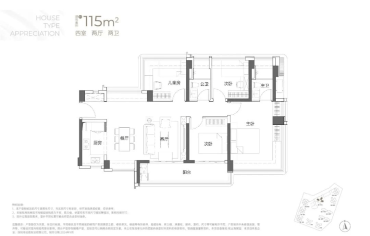 115㎡的4房2厅2卫:横厅南北通透格局,客餐厅6米开间,LDKB一体化,全屋飘窗,4个卧室分别做到了3.9米/3米/2.8米/2.6米的宽度,主卧加1个次卧270°全景飘窗,客厅出6米长的大阳台,L型厨房,得房率约95-97%(包含赠送),西南或东南朝向。115平米户型分布在1栋1单元、1栋2单元、1栋3单元01/02户型,01户型西南朝向都是看小区外围,02户型看向小区;