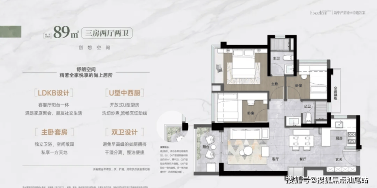 89㎡的3房2厅2卫,设计的是竖厅格局,客厅3.2米开间,LDKB一体化,S墙设计预留冰箱卡槽位,三开间朝南,3个卧室分别做到了3米/2.5米/2.3米的宽度,U型厨房,卫生间三段式分离,得房率:76.55%(不含赠送),有西南或东南朝向。