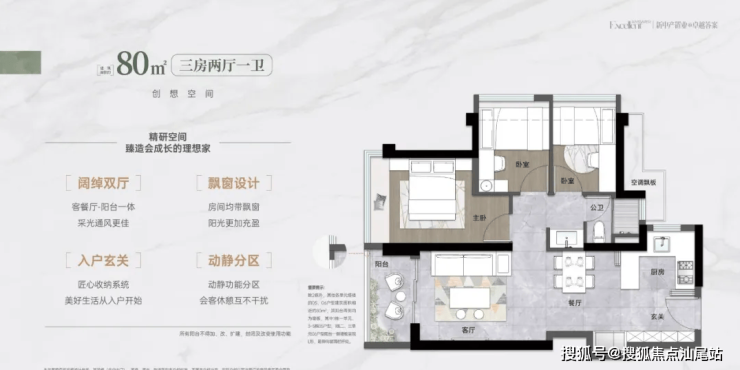 80㎡的3房2厅1卫,设计的是竖厅格局,客厅3.2米开间,LDKB一体化,S墙设计预留冰箱卡槽位,3个卧室分别做到了3米/2.4米/2.25米的宽度,U型厨房,卫生间三段式分离,得房率:76.54%(不含赠送),全部是西北朝向。