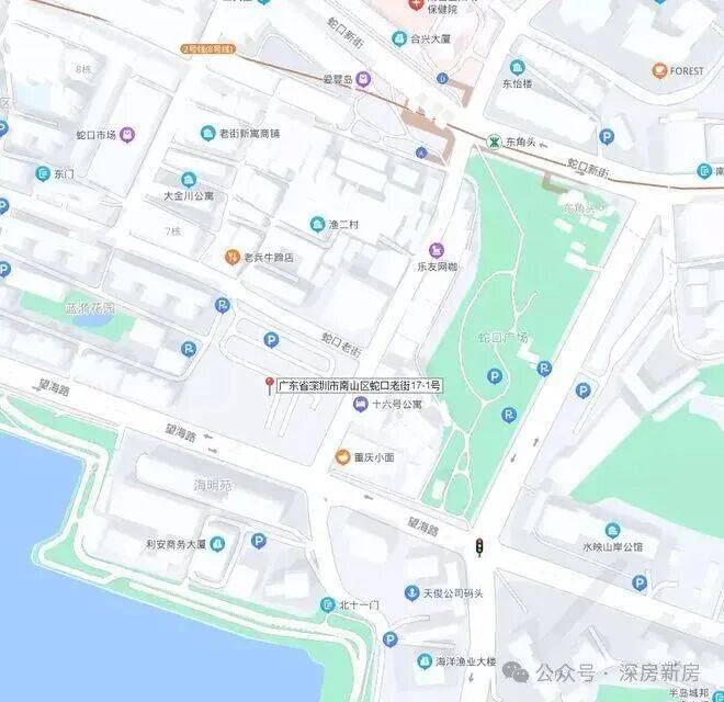 望海玥项目具体位于望海路和湾厦路交汇处,蓝漪花园以东、蛇口老街以南,毗邻蛇口广场,与地铁2号线及13号线(建设中)东角头站相距约200米(地图测量仅供参考)。