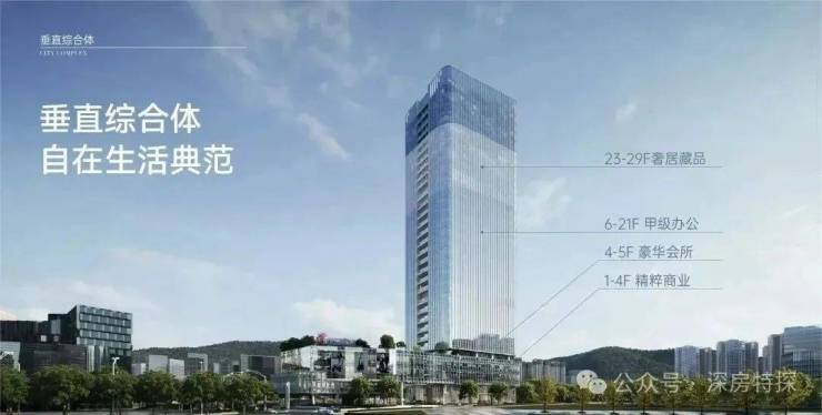 1-2F裙楼商业约1842.35㎡;4-5F会所约3109.14㎡;6-22F甲级办公约35535.02㎡;23-29F云端居所约11882.56㎡。