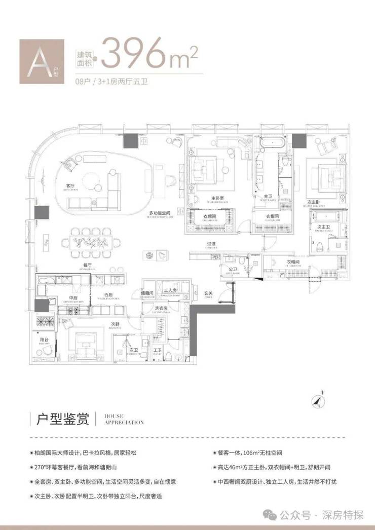 A户型约396㎡为3+1房2厅2厨5卫,西北朝向,全套房双主卧设计,次卧带阳台。