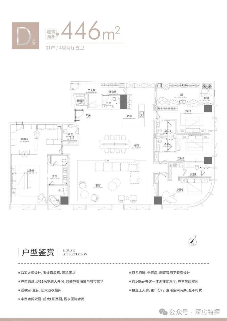 D户型446㎡为4+1房2厅2厨5卫,东南朝向,双龙抱珠全套房设计。