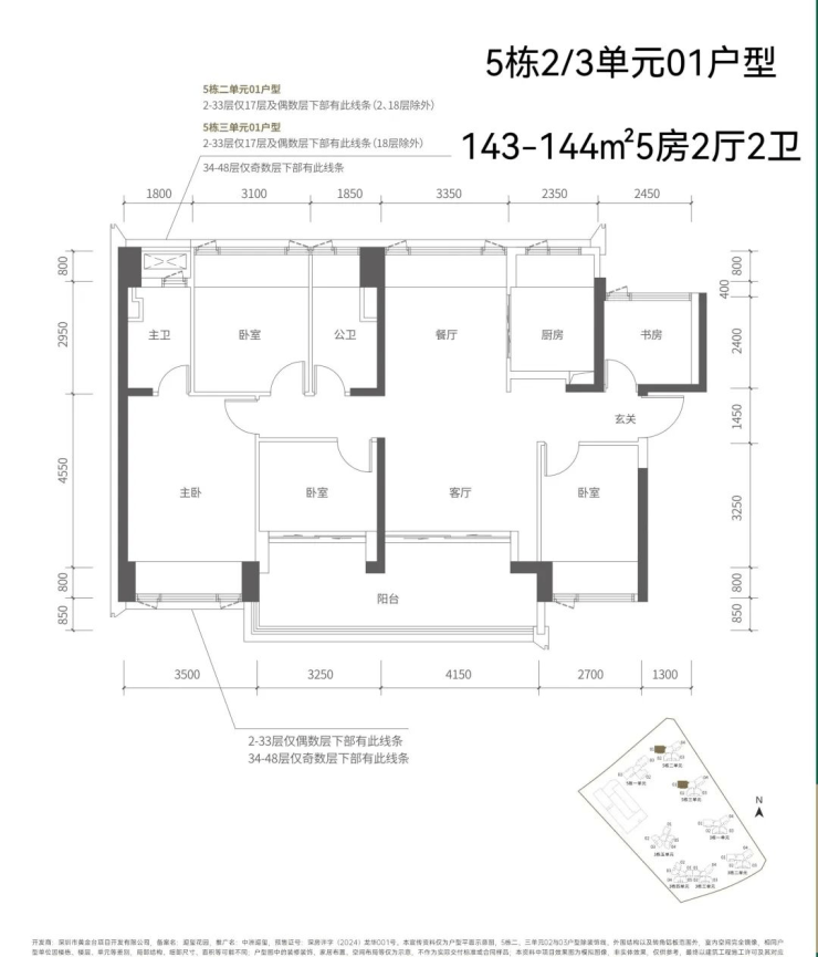 【五栋一单元-平面图】3梯3户,3条腿,分别是01、03号房户型约173㎡的5房2厅2卫、02号房户型约149㎡的5房2厅2卫