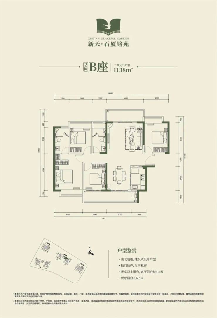 2栋B座一单元01、04户型、2栋B座二单元01户型:面积约为137-138㎡的4房2厅2卫