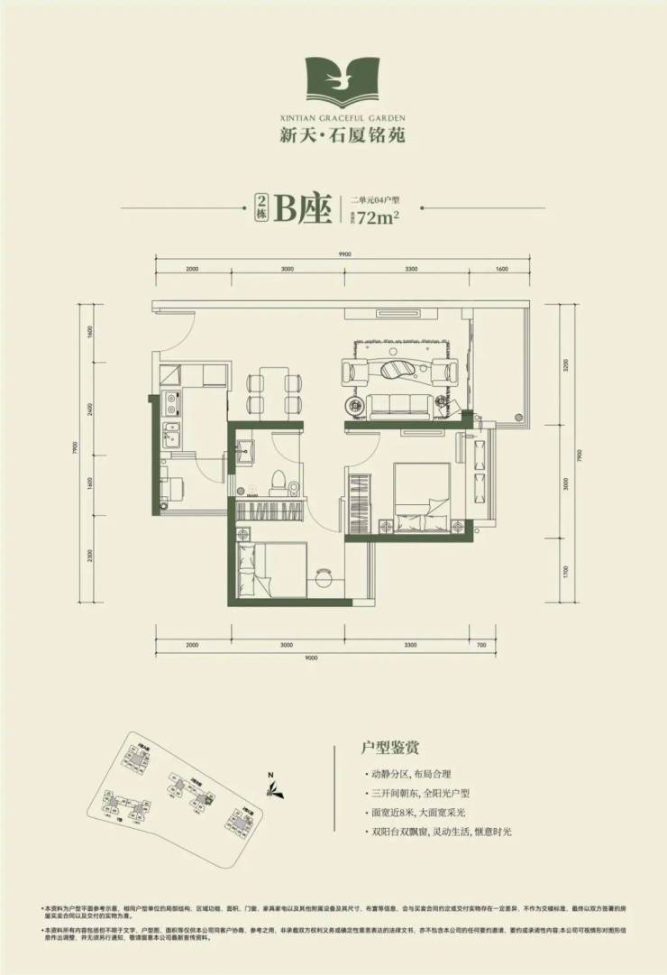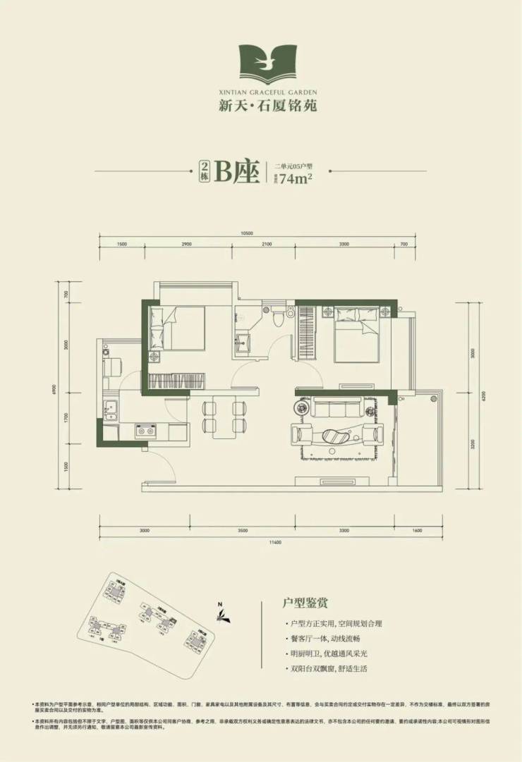 2栋B座二单元04、05户型:面积约为72-74㎡的2房2厅1卫