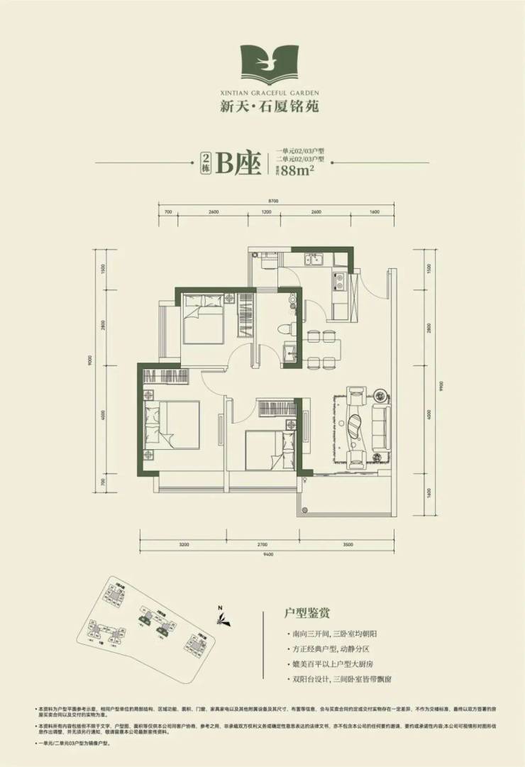 2栋B座一单元02、03户型、2栋B座二单元02、03户型:面积约为88㎡的3房2厅2卫