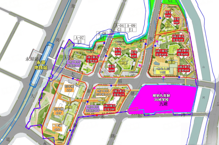 总占地面积约7.61万㎡,总建筑面积约65.4万㎡,共分6个地块开发,由11栋43-50F商品房,1栋安居房49层,1栋公租房46层,3栋办公楼组成,另外配建1所18班幼儿园,1所九年制36班学校组成;按照平均100㎡/套计算,大概3472套房源(其中商品房约2962套)。