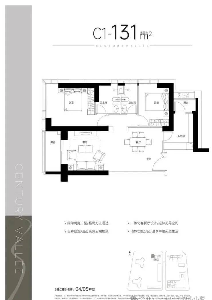 项目简介:总建筑面积约39万㎡,涵盖天际住宅、高端公寓、下沉式商业街等多种业态为一体,最新推出二期3栋C座建面约131-262㎡天幕公馆、C1户型——建面约131㎡2室2厅2阳台。